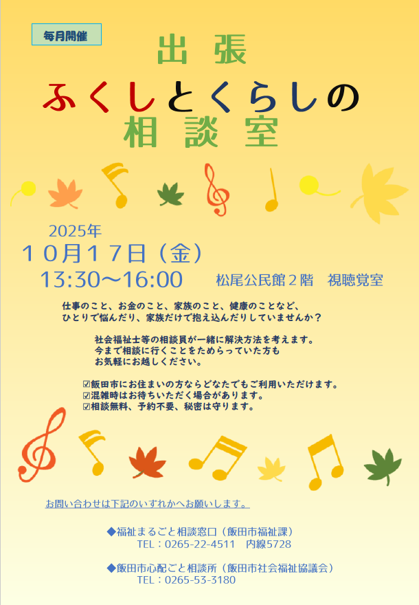 飯田市社会福祉協議会では、飯田市福祉課との共催で、各地区に出向き出張ふくしとくらしの相談室を実施しています。
