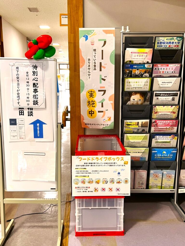 飯田市ボランティアセンター(飯田市社会福祉協議会内)では、「フードドライブ回収ボックス」をさんとぴあ2階の事務所前に設置しました。