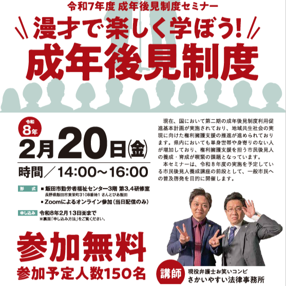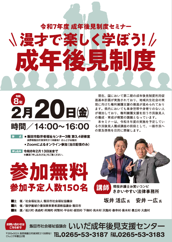 いいだ成年後見支援センターでは、令和7年度「成年後見制度セミナー“漫才で楽しく学ぼう!”成年後見制度」を開催します。