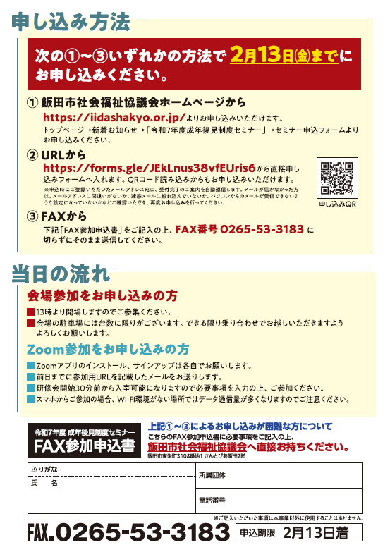 形式 会場参加(先着150名)飯田市勤労者福祉センター3階 第3,4研修室(長野県飯田市東栄町3108番地1 さんとぴあ飯田)