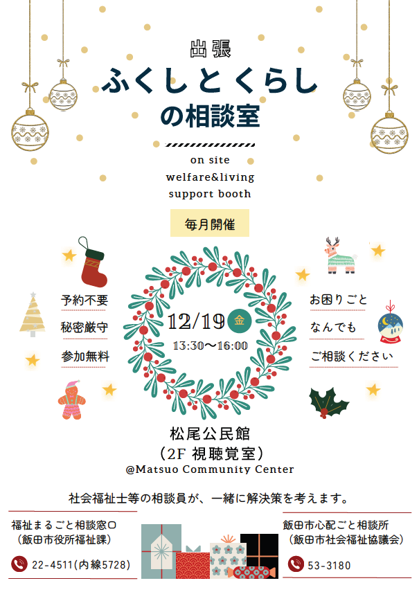 飯田市社会福祉協議会では、飯田市福祉課との共催で、各地区に出向き出張ふくしとくらしの相談室を実施しています。