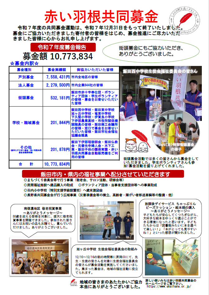 令和7年10月1日から全国一斉に実施いたしました共同募金活動におきまして、市民のみなさまより 総額10,773,834円の募金をお預かりいたしました。活動にお力添えをいただきました関係者皆様に心より感謝申し上げます。