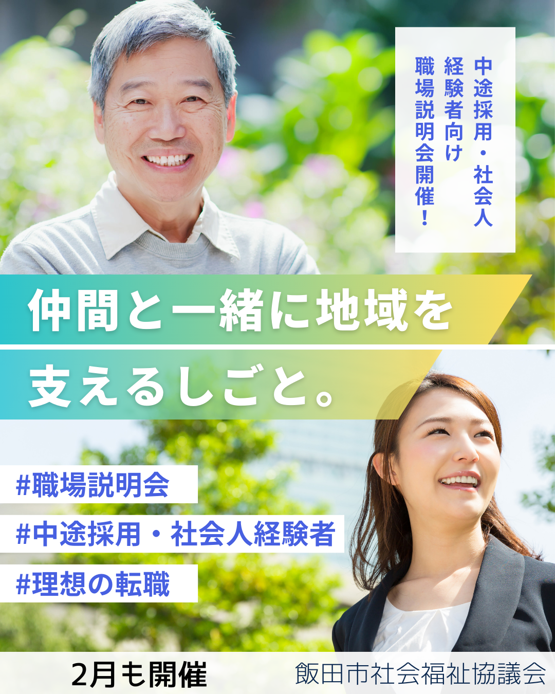 飯田市社会福祉協議会では、随時採用および令和8年4月採用の職員募集にあわせ、中途採用・社会人経験者向けの職場説明会を開催いたします。ぜひお気軽にご参加ください。穏やかでやりがいのある職場で、私たちと一緒に働きませんか?