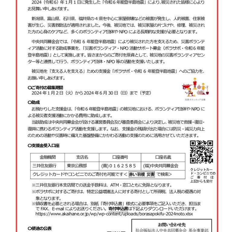 お知らせボランティア赤い羽根共同募金 共同募金「ボラサポ・令和6年度能登半島地震」第4回助成事業について 2024年6月18日 共同募金「ボラサポ・令和6年度能登半島地震」第4回助成事業につい… 続きを読む